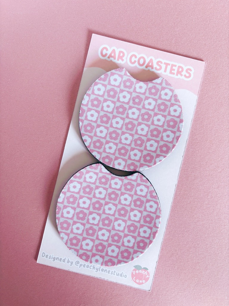 Retro Pink Flowers Car Coasters - Set of Two